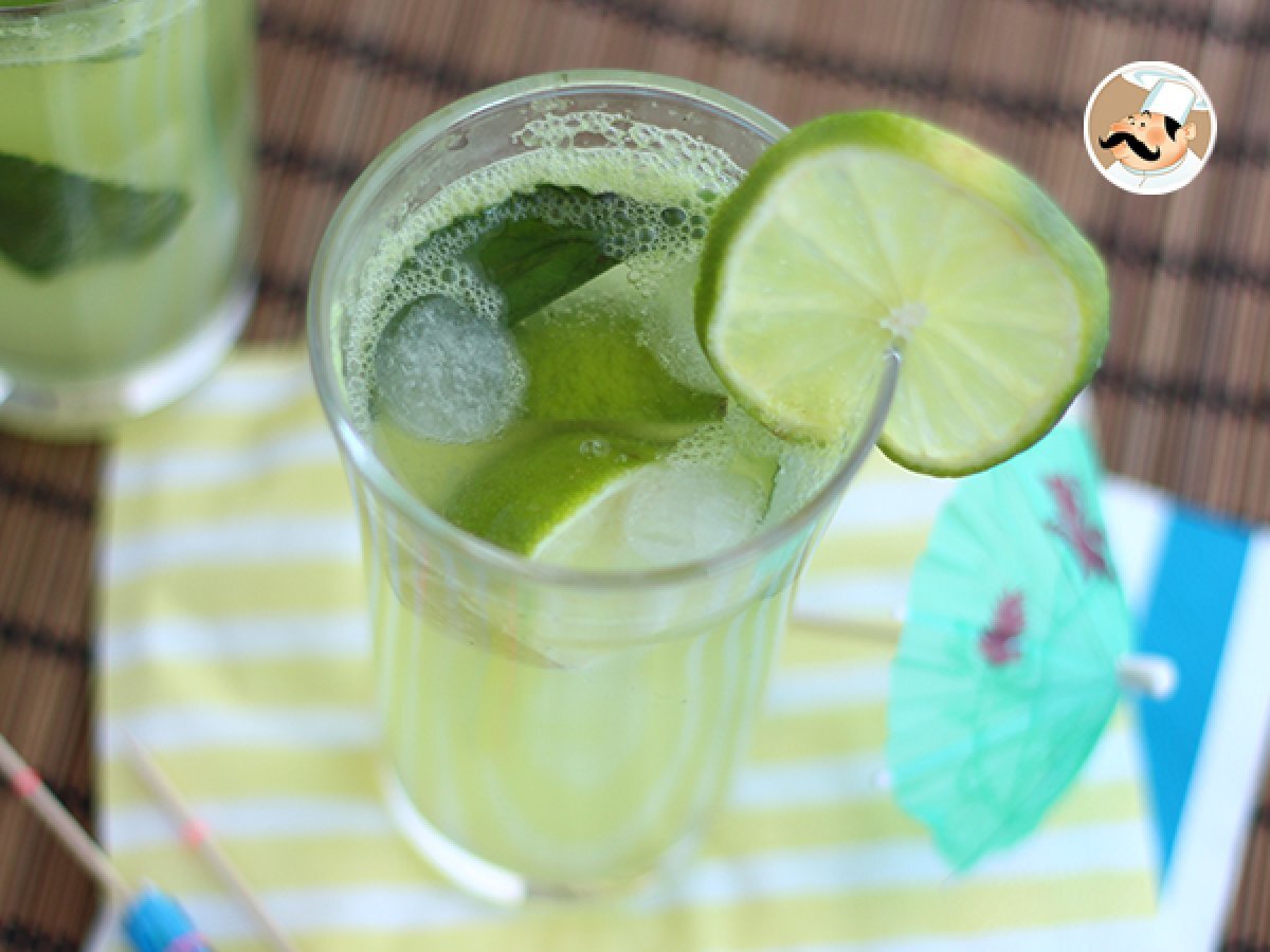 Server den i kolde mojito-glas med isterninger og pynt med mynte og lime for en frisk præsentation.