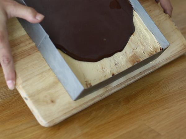 Hæld chokoladen over Opéra, og vip rammen for at sprede chokoladen over hele overfladen. Stil på køl i 15 minutter, så chokoladen kan sætte sig.