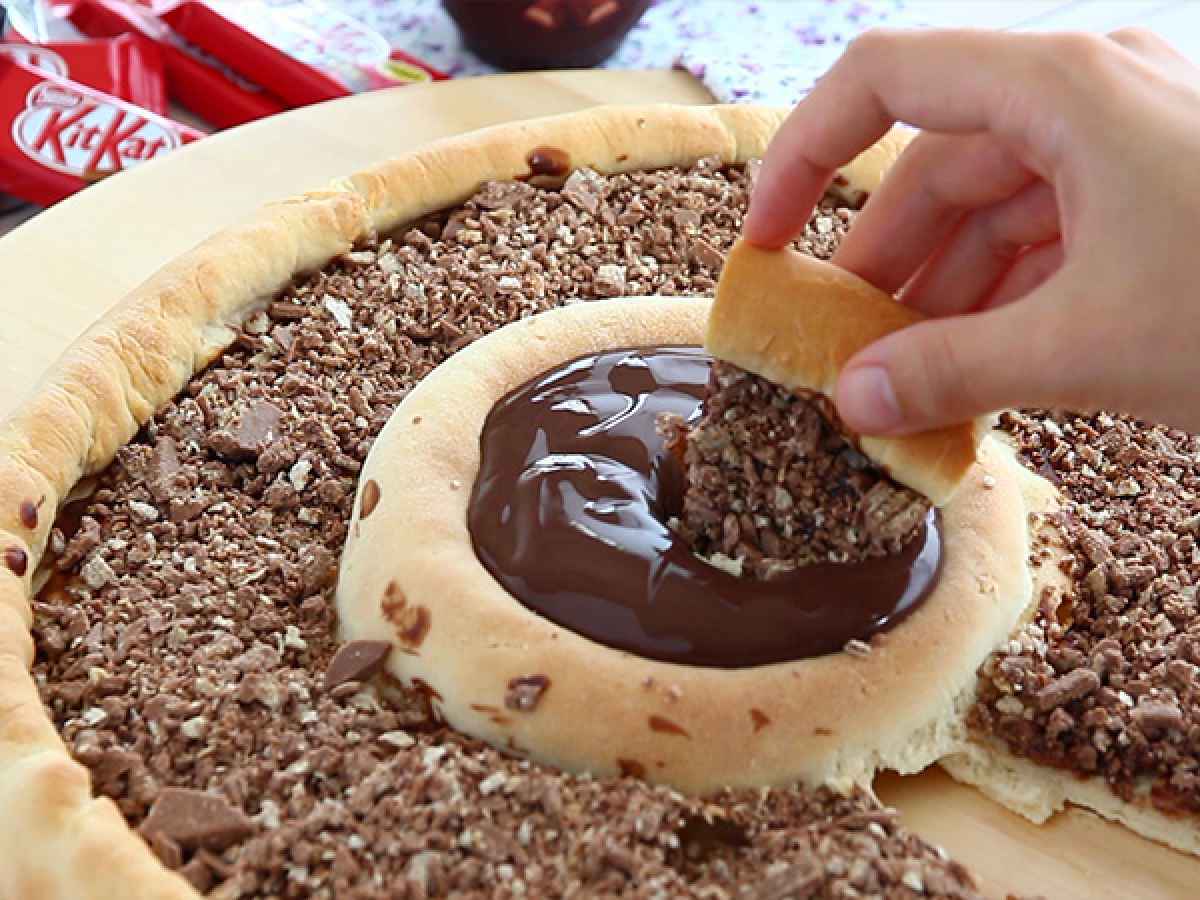 Fyld hullet i midten med chokoladecreme. Og så er din Kit Kat-pizza klar, du skal bare skære et stykke og dyppe det i chokoladecremen i midten!