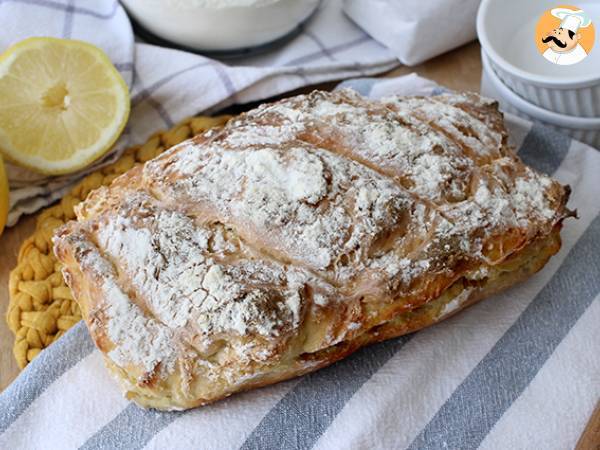 Læg dejen i en rektangulær form, lav nogle snit med en kniv, og drys lidt mel på toppen.