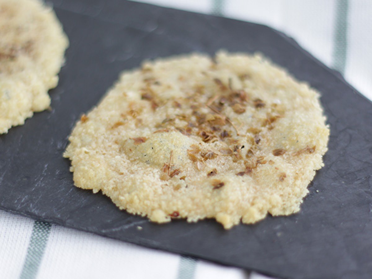 Læg små bunker af revet parmesan på en bageplade, og tryk dem lidt flade, så de får en rund form.