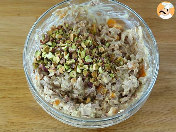 Tilsæt løg og gulerødder, og bland. Knus pistacienødderne, og tilsæt dem til blandingen. Stil på køl i et par timer.