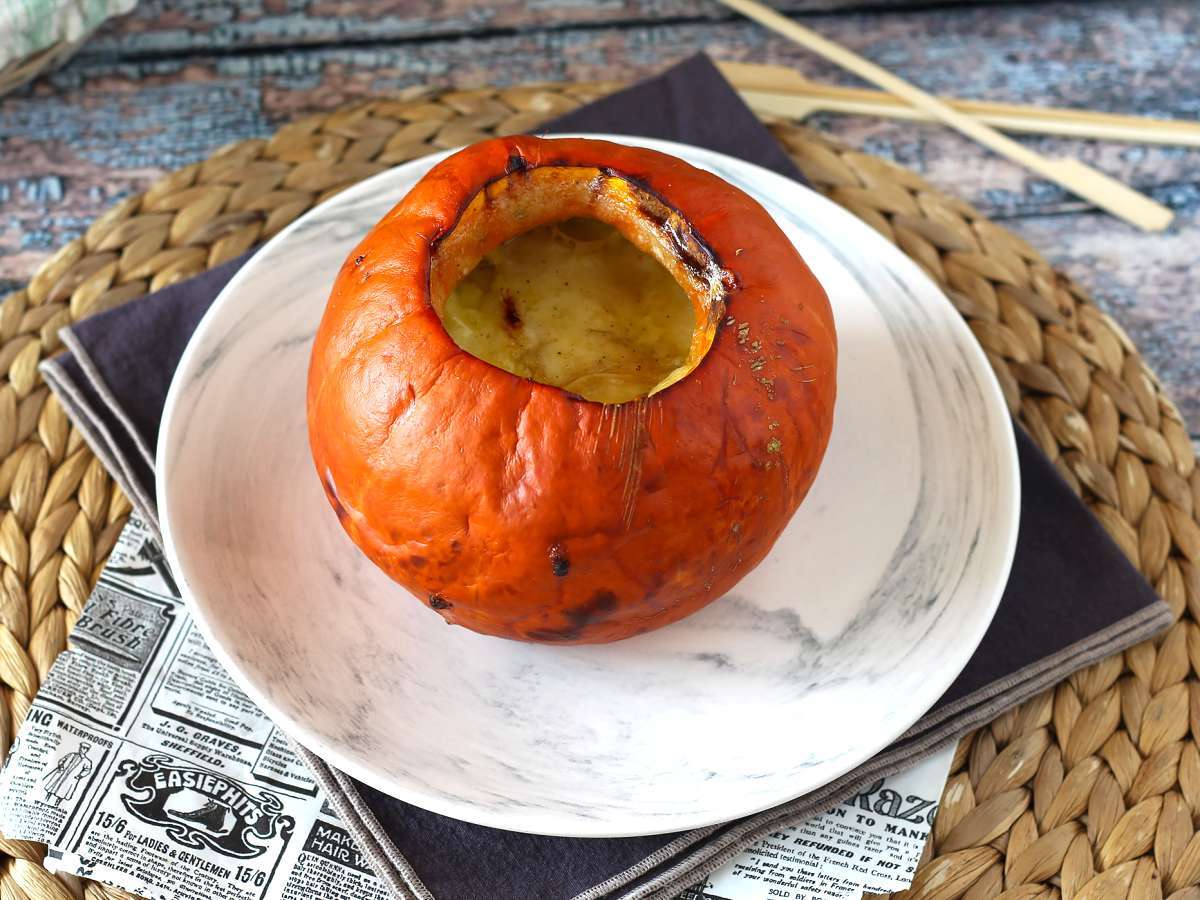 Sæt det fyldte græskar i en ovn, der er forvarmet til 180 °C, og bag det i 20 minutter.