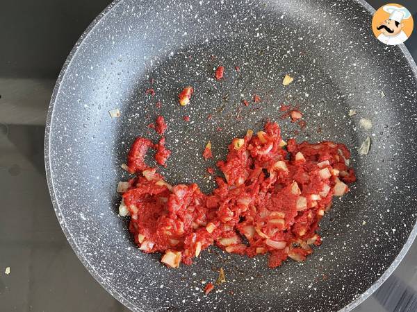 Tilsæt tomatpuréen til løg- og hvidløgsblandingen, og rør godt rundt, så alle ingredienserne bliver integreret. Tilsæt derefter spidskommen + oregano + brun farin + eddike + salt + peber. Bland det hele sammen.