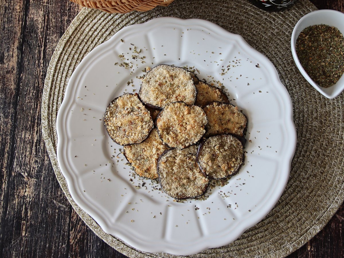 Drys nu hver skive aubergine med brødkrummer, og prøv med en finger at sprede dem jævnt over hele overfladen (laget af brødkrummer skal være kompakt og ikke for tykt). Krydr med salt og peber, og bag i 20/25 minutter ved 190 °C.