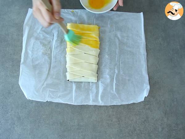 Skær de to andre ender til, så de passer til hyldens længde. Fjern de afklippede stykker. Fold strimlerne ind mod midten, så de overlapper hinanden fra venstre mod højre. Pensl med æggeblomme.